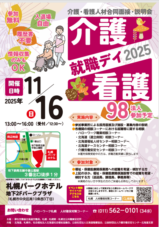 お知らせ 介護看護人材合同面接・説明会2025 介護・看護人材合同面接・説明会 2025 介護・看護就職デイ2025 当事業所は11月16日(日)に開催される面接説明会に出展いたします。皆様のご来場を心よりお待ちしております。 https://jsite.mhlw.go.jp/hokkaido-hellowork/list/sapporo/shisetsu/kaigokangoday2025.html